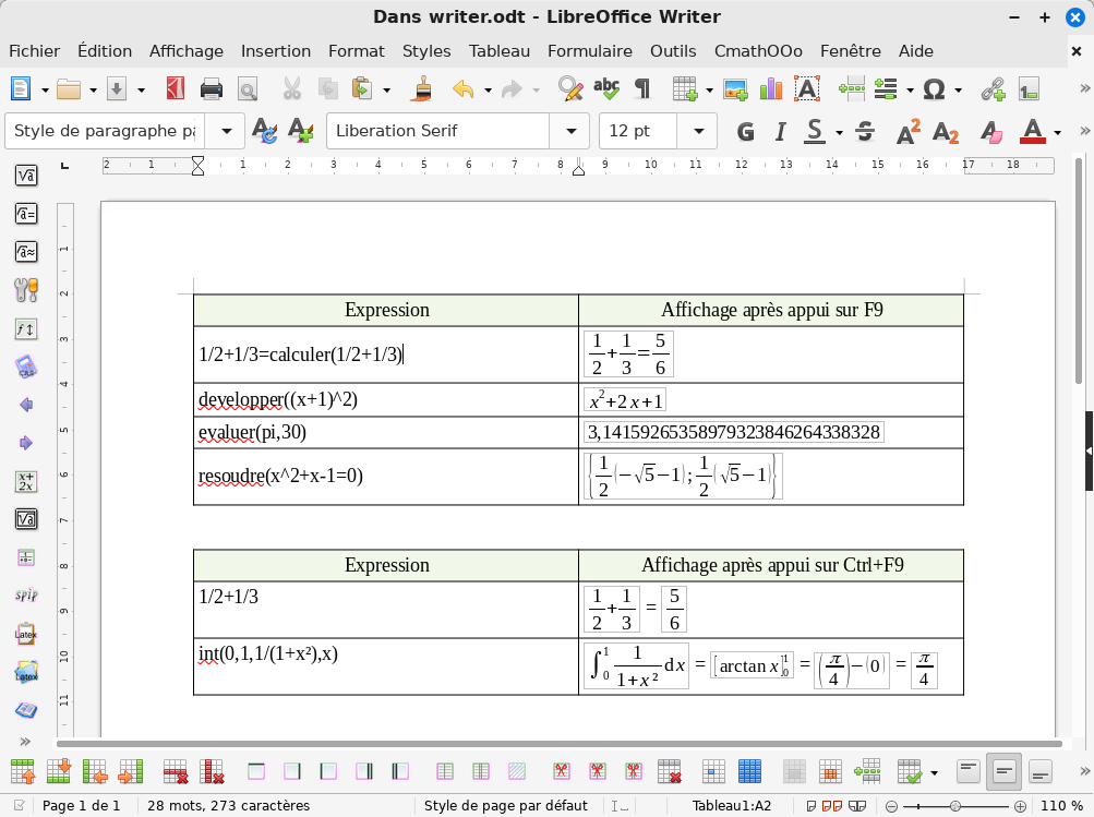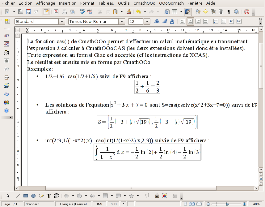 Voir aussi la documentation disponible dans le menu CmathOOoCAS après installation de l’extension.