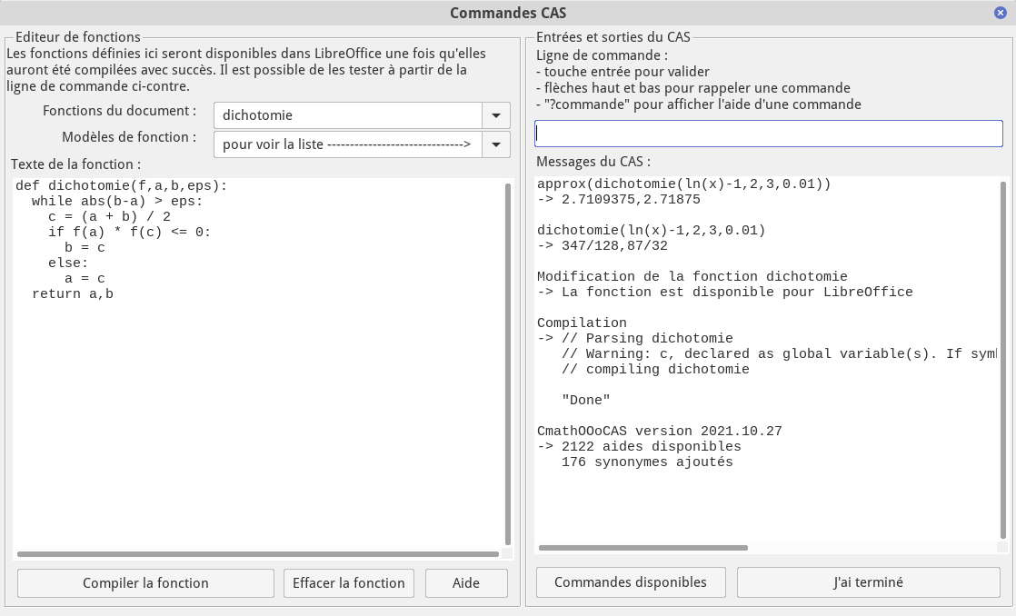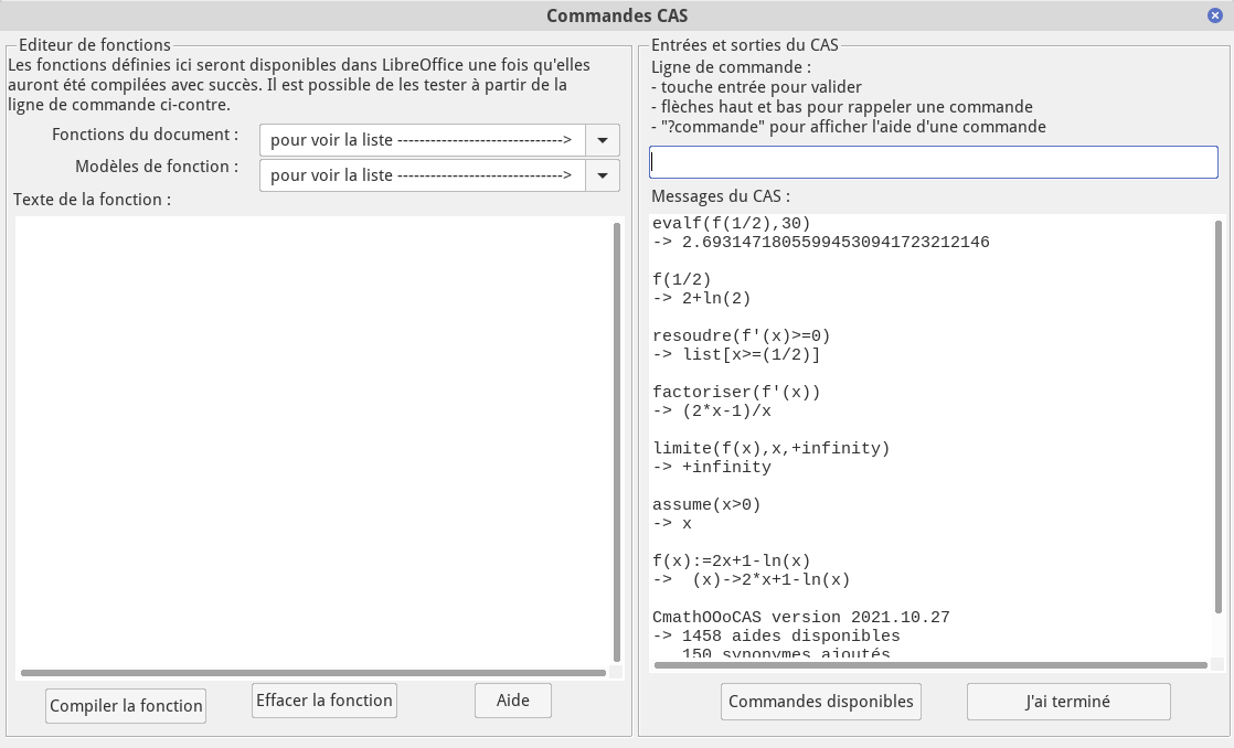 Une boîte de dialogue contenant un éditeur de fonctions ainsi qu’une ligne de commandes de calculs formels est accessible via le menu CmathOOoCAS ou l’icône de la barre de menu CmathOOoCAS.