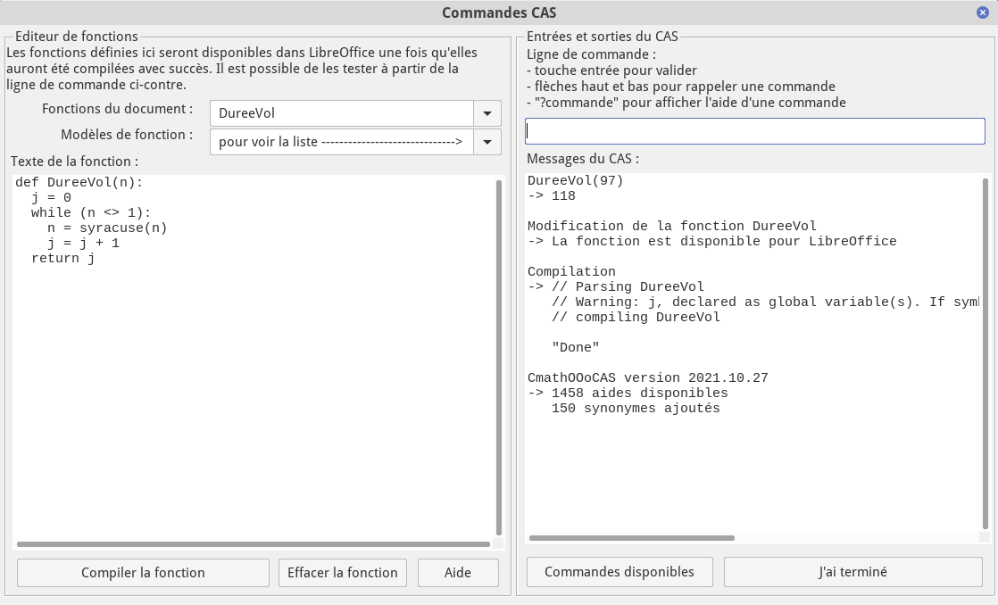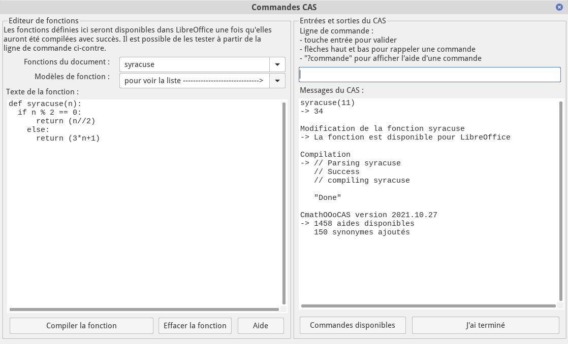 – La partie gauche est composée d’un éditeur permettant de créer ses propres fonctions. Une fois compilées à l’aide du bouton ad-hoc, la ligne de commande peut servir à tester le bon fonctionnement de ces fonctions :