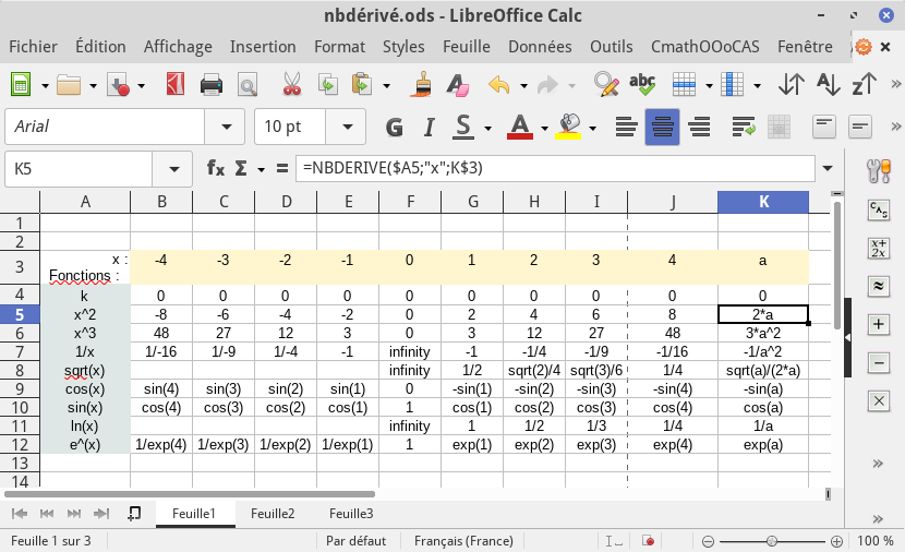– Toutes les fonctions formelles de XCAS sont utilisables dans CmathOOoCAS. Par exemple la fonction calculant le nombre dérivé en $a$, tel qu’il est défini en mathématiques