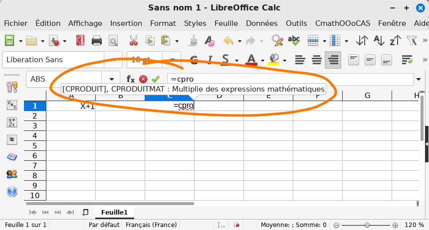 De façon générale, lorsqu’une fonction existait dans Calc (comme ici SOMME et PRODUIT) CmathOOoCAS ajoute la même fonction précédée de la lettre C comme "CAS". Ces nouvelles fonctions opèrent sur des objets formels. Ainsi, on trouvera, par exemple, dans CmathOOoCAS les fonctions : CLN, CEXP, CPUISSANCE, CSIN, CRACINE, etc...