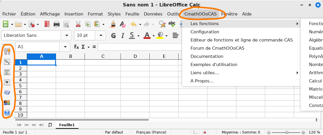Une fois l’extension installée (téléchargement de CmathOOoCAS) et LibreOffice redémarré, vous obtiendrez dans Calc un menu "CmathOOoCAS" et une barre d’outils supplémentaires :