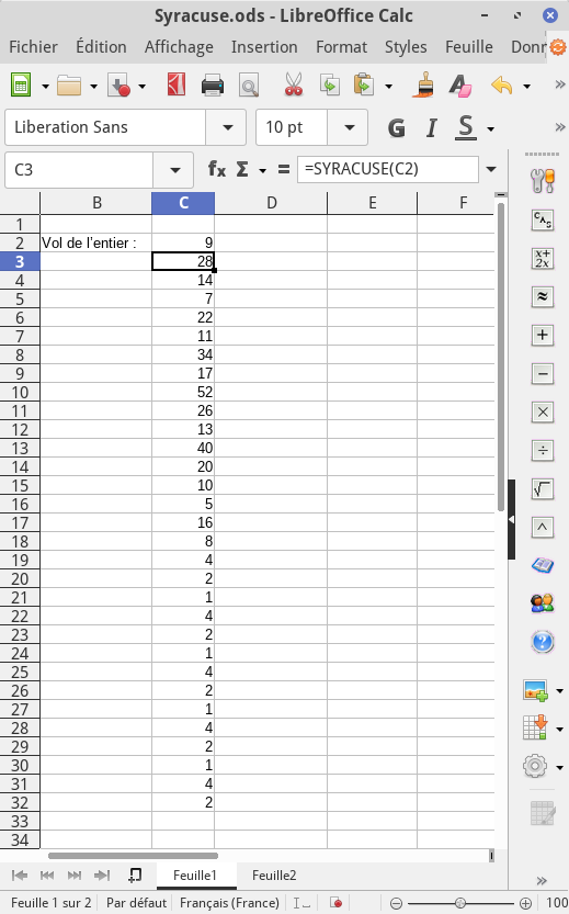– Une fois compilées, les fonctions créées sont sauvegardées avec le document et sont immédiatement disponibles dans le tableur :