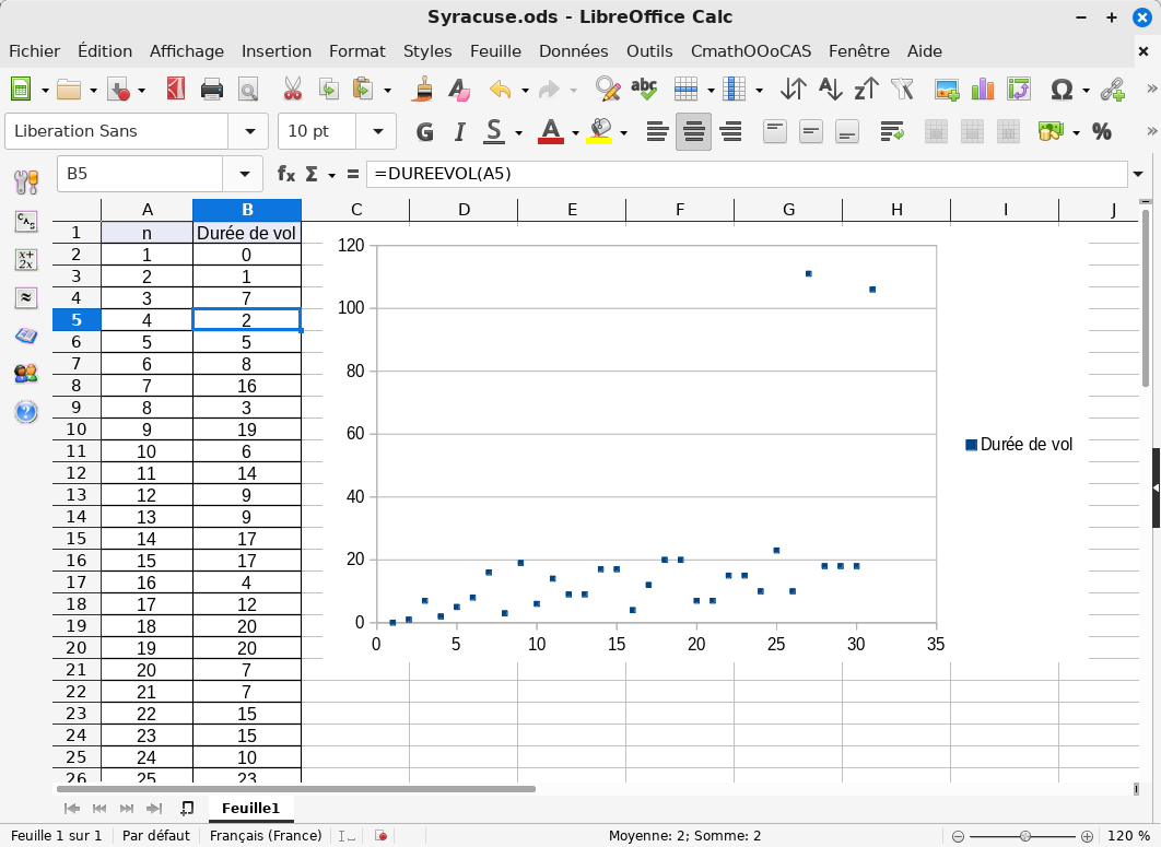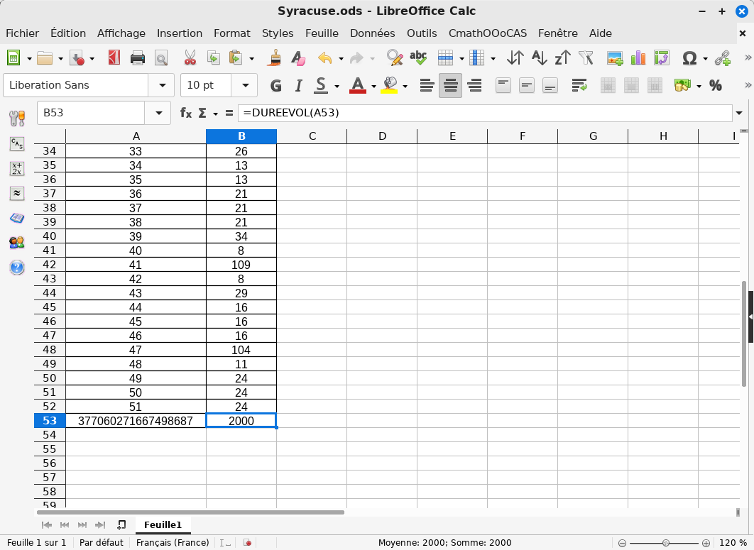 – Ces nouvelles fonctions exploitent les possibilités apportées par le moteur de calcul formel Giac et peuvent travailler dans $\mathbb{C}$. Grâce aux capacités de calculs de CmathOOoCAS sur des entiers longs, on peut répondre partiellement au défi lancé en l’an 2000 : « Quel est le plus petit entier $n$ dont la durée de vol est 2000 ? » :