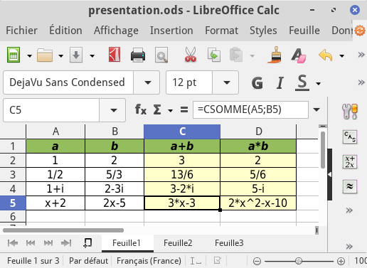 En plus des exemples présentés sur cette page, des activités utilisant les fonctions formelles de CmathOOoCAS sont accessibles à cette page.