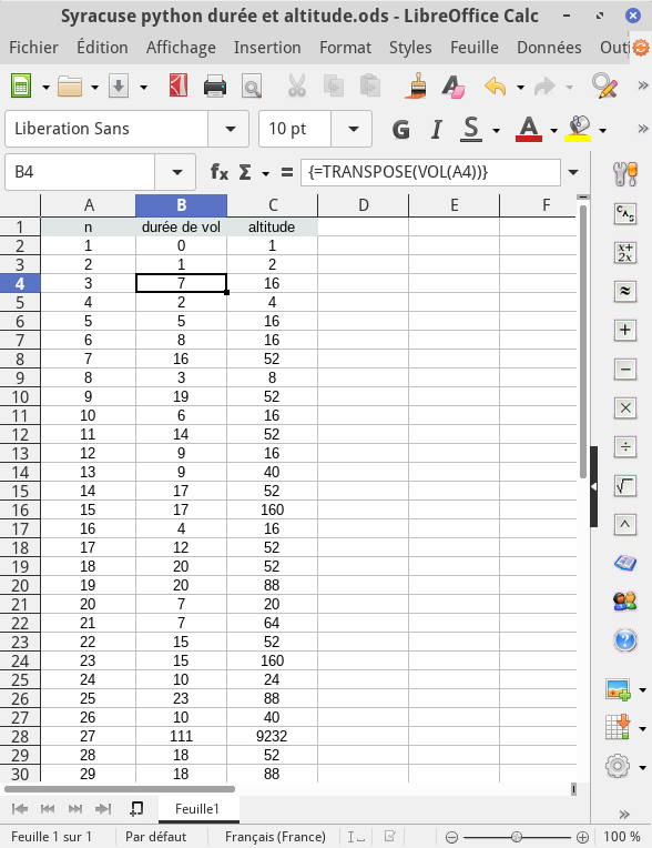 – Si on préfère une écriture du vecteur en ligne plutôt qu’en colonne, la fonction TRANSPOSE pourra être utilisée. Reprenons l’exemple de la suite de Syracuse et définissons la fonction VOL(n) renvoyant pour un entier n, le vecteur (durée,altitude) du vol de cet entier.