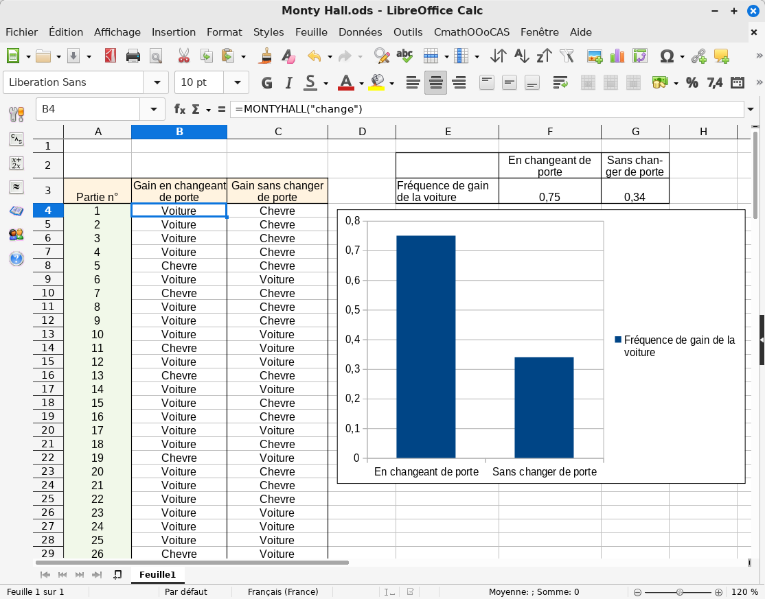 En appuyant sur Ctrl+Maj+F9, Calc recalcule toutes les cellules ce qui permet de resimuler 200 nouvelles parties. On constate qu’il vaut mieux changer de porte pour espérer gagner la voiture.
