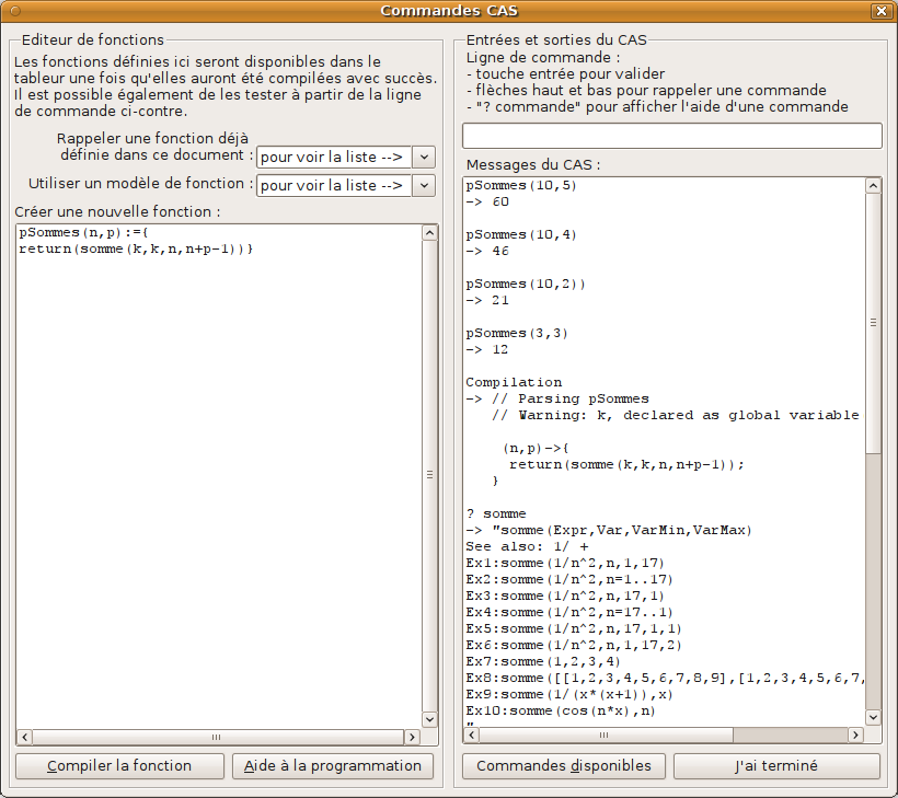 2. A l’aide de l’éditeur de fonctions (icône "CAS") compiler la fonction suivante (qui calcule la somme de $p$ entiers consécutifs en commençant à $n$) :