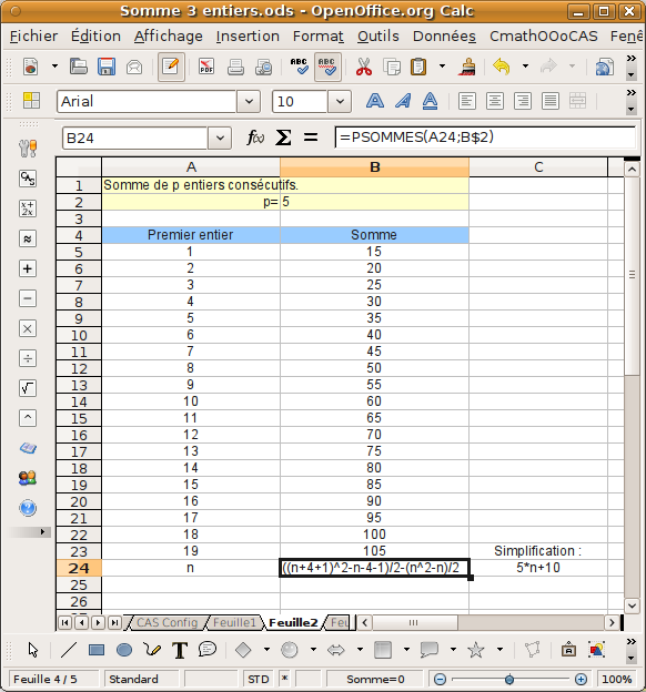 5. Remplacer le premier entier 20 par $n$. Dans la colonne C, demander la simplification du résultat obtenu.